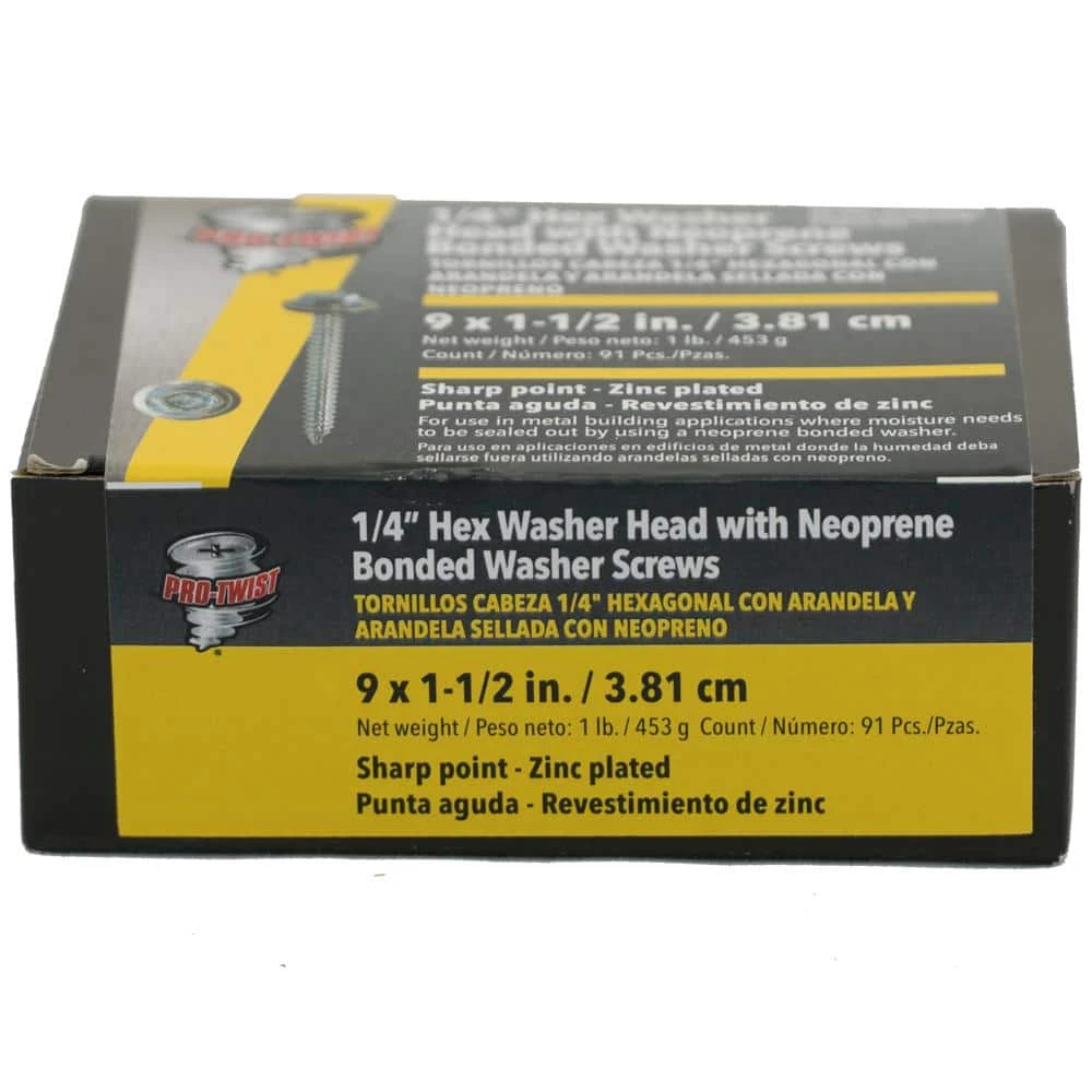 The Pro-Twist #9 x 1-1/2 in. hex washer head with neoprene bonded washer fastener is ideal for attaching roofing, siding and wall panels to wood framing. The neoprene-bonded washer provides an effective waterproof seal. Pro-Twist fasteners are triple tested for quality and made from 1022 carbon steel so you always get faster, easier penetration and less installer fatigue. In fact, we’re so proud of our Pro-Twist fasteners we’ve emblazoned each 1 with a unique PT stamp making it readily identifiable even after installation and makes it obvious that you use the very best fasteners.