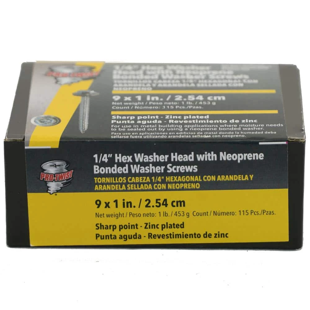 The Pro-Twist #9 x 1 in. hex washer head with neoprene bonded washer fastener is ideal for attaching roofing, siding and wall panels to wood framing. The neoprene-bonded washer provides an effective waterproof seal. Pro-Twist fasteners are triple tested for quality and made from 1022 carbon steel so you always get faster, easier penetration and less installer fatigue. In fact, we’re so proud of our Pro-Twist fasteners we’ve emblazoned each 1 with a unique PT stamp making it readily identifiable even after installation and makes it obvious that you use the very best fasteners.