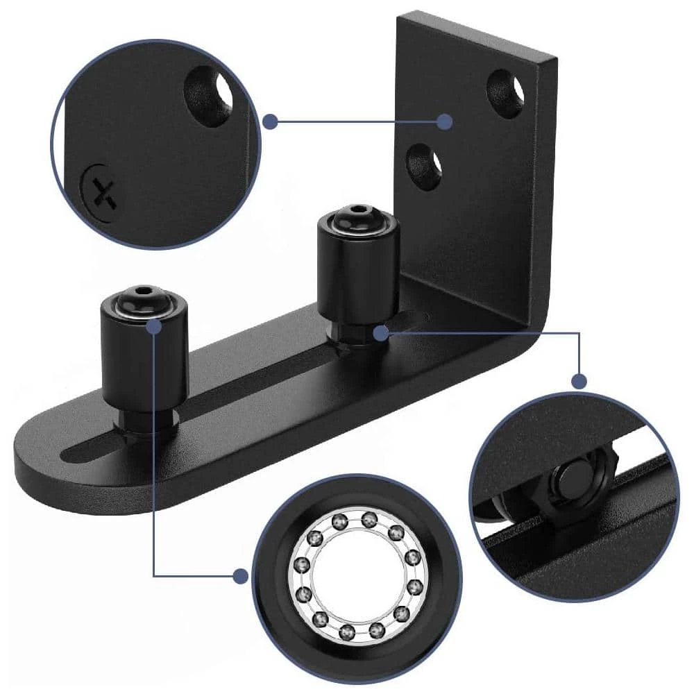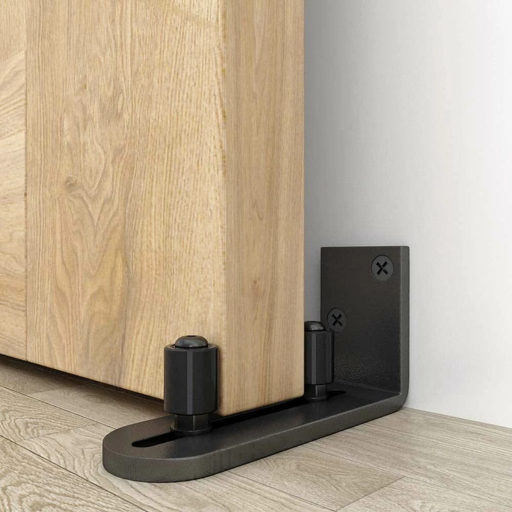 - Fine black powder coated barn door bottom roller guide is tough, durable and rustproof, flush with the floor/ground, no screws protrude from the bottom, no groove required for door, no drilling on the floor