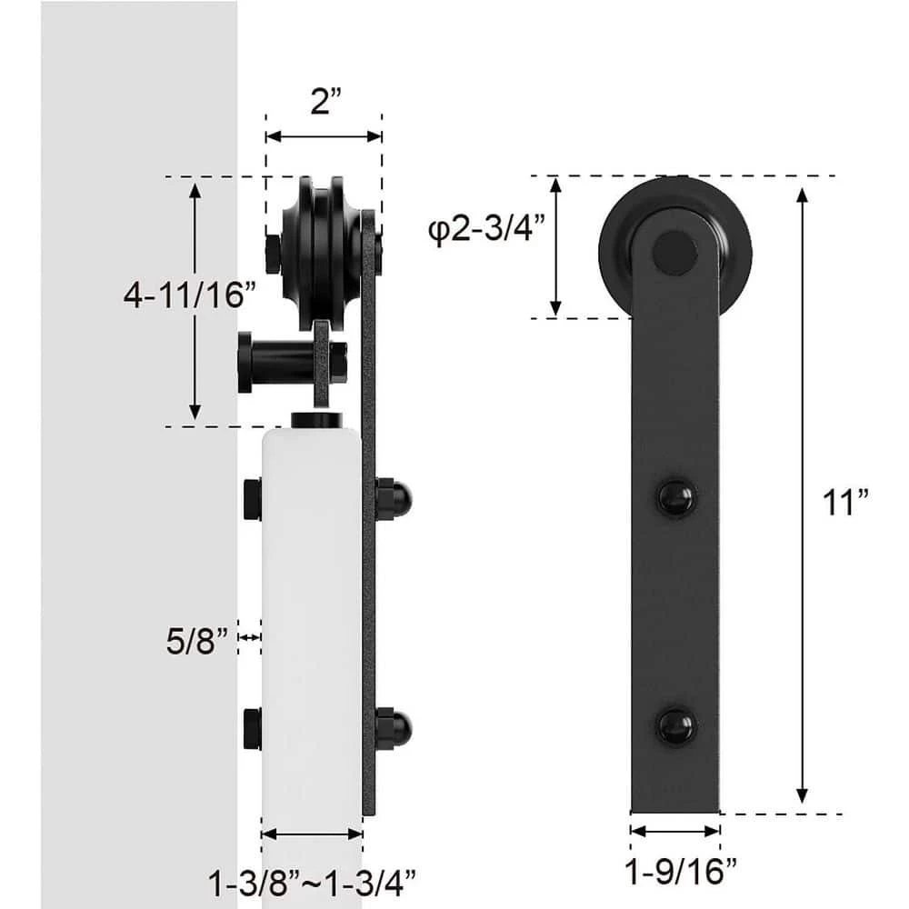 - Suitable for 1 3/8 in.- 1 3/4 in. thick doors such as barn doors, closet doors, garage doors, garden sheds, wine cellars, etc. door Weight Capacity: 230 lbs, need a minimum of 5 in. clearance from the top of your door to the ceiling (or crown molding, if any) for this kit to fit correctly
