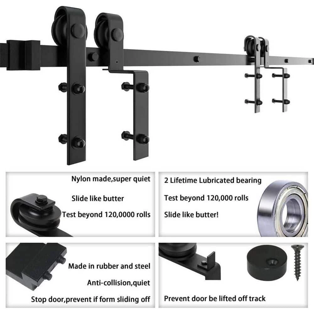 - Design: the classic and simple design will not be outdated, the balanced and smooth rail keeps the wheels rolling easily and guarantees the door not jumping out of the track, high density plastic wheels provide ultra-quiet experience, door stoppers keep the exact sliding range and the strong floor guide stabilizes door movement
